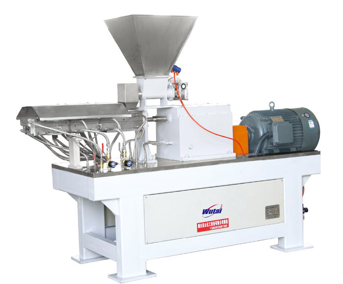 This extruder is co-rotating twin screw extruder ,materials can achieve ideal dispersed and kneaded effect after fully hot-melted under the precise intermeshing action of the conveying elements and kneading elements on the screws. Main Features *High output capacity and excellent mixing efficiency, glossiness can increased 3-5 degree than normal extruder. *Clamshell barrel has high efficient heat-exchange and automatic temperature control system *Barrel is opposite open type,easy to clean *Hopper with screw shaft ensure the uniform feeding *Automatic alarm of lubricating oil control system *Advanced two way PID temperature control system with tolerance ±2℃ *The clamshell barrel cooled by automatic recycle filter water (optional equipment) *Screw sleeve is segment liner design *3 types electric control type for your choose (a) Normal control (b) design according to the EU standard. (c) Touch screen computer display and PLC control *Gearbox designed in lower noise and high speed *To void the raw material jam in the hopper , the feeder is with vibrate or swing system(option equipment) *There is strong permanent metal magnetic detector system